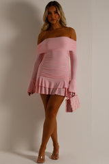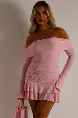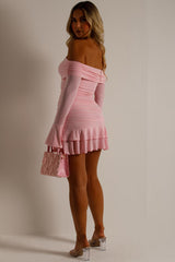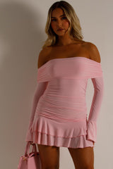 Bardot Mini Dress With Ruffle Frill Hem And Long Sleeves Pink