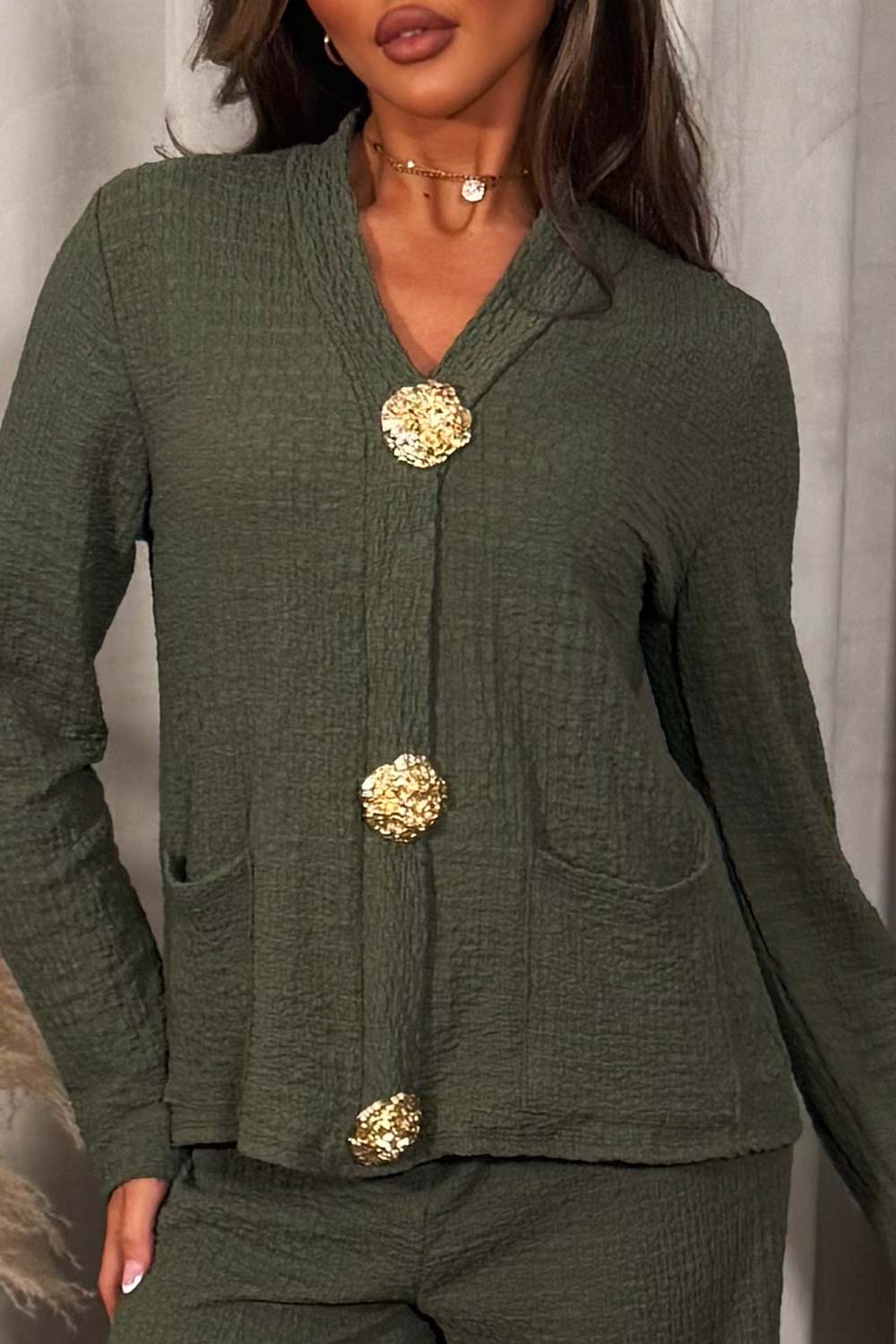 Gold Button Long Sleeve Top And Trouser Co Ord Set Khaki