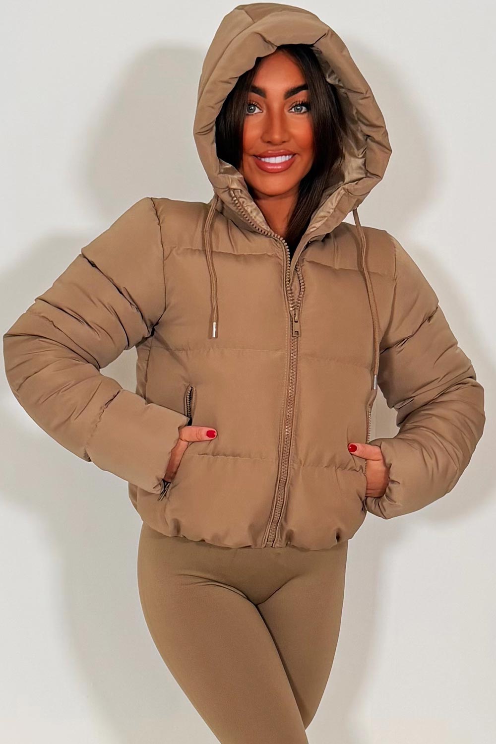 Hooded puffer jacket. This puffer jacket is A need for your outerwear wardrobe. Featuring hooded puffer jacket with drawstring zip fastening pockets weather resistant windproof and premium quality. Style it with our ribbed leggings and fresh kicks to complete the look we are loving. Also available in Black.