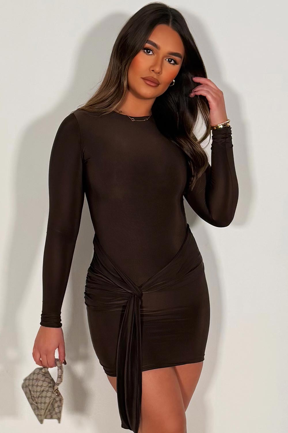 Long sleeve mini dress with drape detail. This is perfect date night dress and its also going to be your go to occasion dress. Featuring mini dress with long sleeves round neck and drape detail, really soft stretch slinky fabric. Style this long sleeve short dress with matching accessories to complete the look we are loving. This drape front mini dress is also available in other colours.