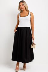 Sleeveless racer maxi dress with contrast skirt. This maxi dress is going to give you cool chic look, an essential for your summer holiday dress wardrobe. Featuring sleeveless ribbed contrast maxi dress ankle length ribbed woven blend square neck pockets in skirt, perfect summer holiday outfit for you. Style this racer maxi dress with matching accessories to complete the look are loving. This summer maxi dress is also available in other colours colours.