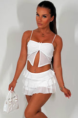 Ruffle frilly skort and top mesh top co ord set. This festival skort and top set is going to keep all eyes on you babe, an essential for your summer clothes wardrobe. Featuring mini skort skirt with mesh ruffle frilly detail and matching crop top two piece co ord set. style this festival outfit with matching accessories to complete the look we are loving. This skort and top two piece co ord set is also available in other colours.