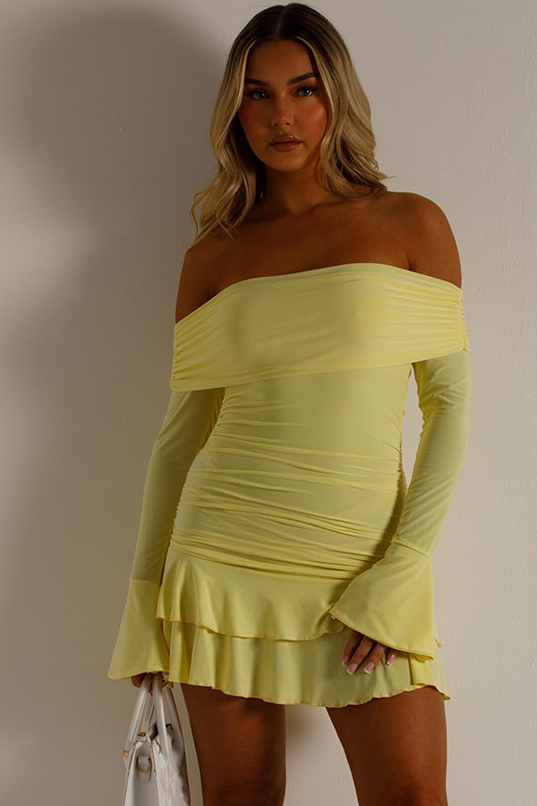 Bardot Mini Dress With Ruffle Frill Hem And Long Sleeves Yellow