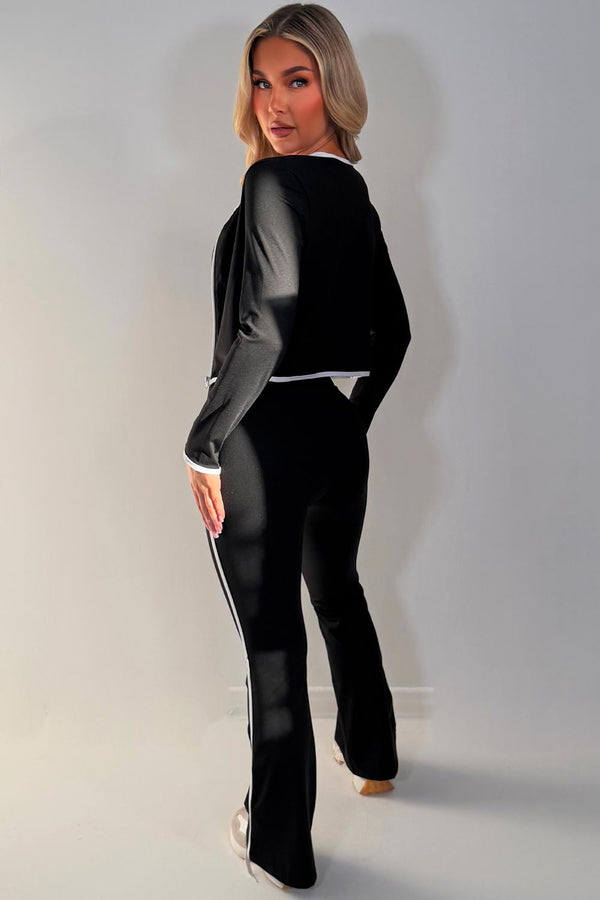 Black Flare Pants Zip Up Sports Jacket And Crop Top 3 Piece Co Ord Set