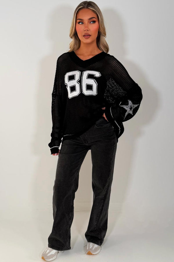 Knitted jumper with long sleeves. Long sleeve knitted jumper with 86 Boston slogan relaxed casual fit. Style this fishnet knitted jumper with any outfit to complete the edgy casual look...