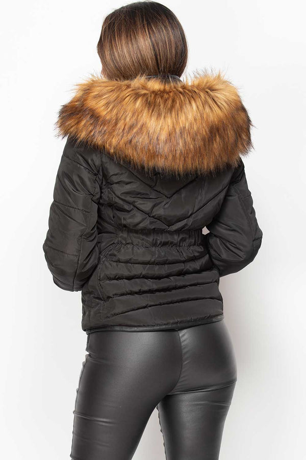 Black quilted puffer coat with big faux fur hood, zip and stud fastening, pockets and ruched detail on back. Weather resistant, thick padded and warm coat. Style it with our...