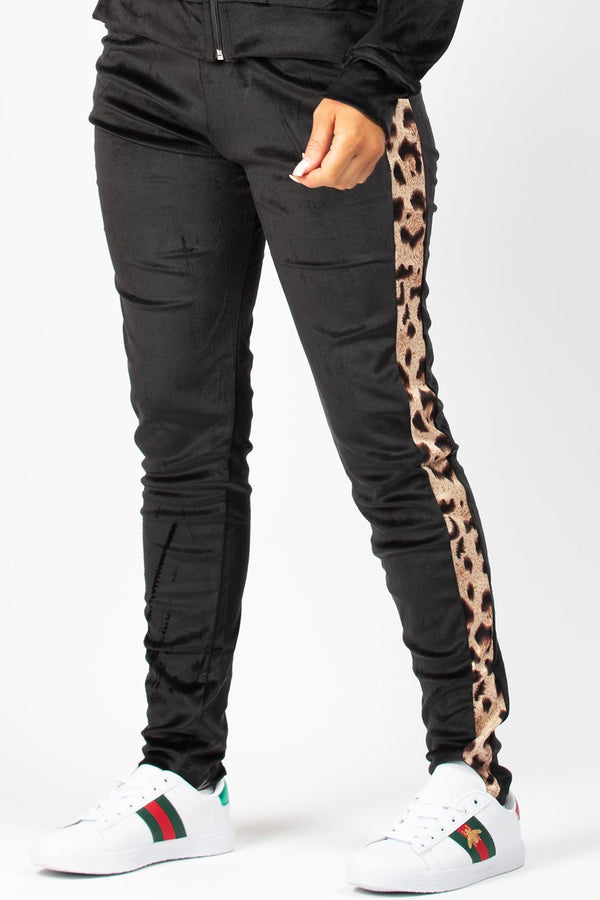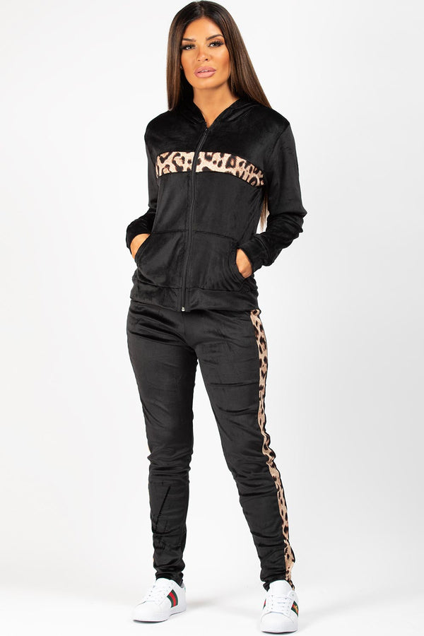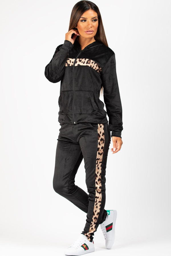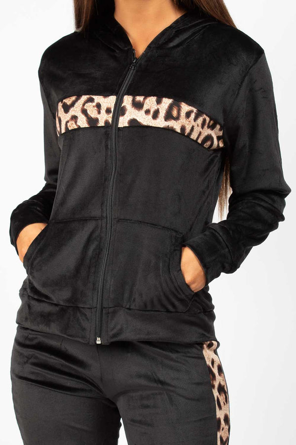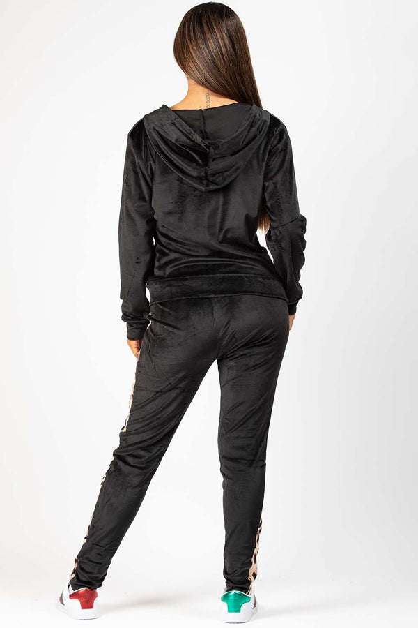 This black velour lounge set is sure to give you cool casual feminine vibes. Featuring velour fabric, hooded tracksuit top with zip fastening and leopard print stripe and matching elasticated waist...