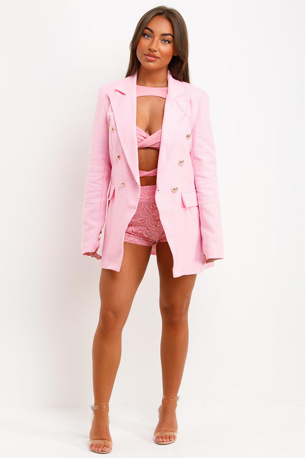 Blazer jacket with gold buttons. This gold button blazer jacket is perfect for any occasion babe. Featuring blazer jacket with gold button detail, mock tweed textured fabric , relaxed fit...