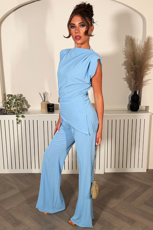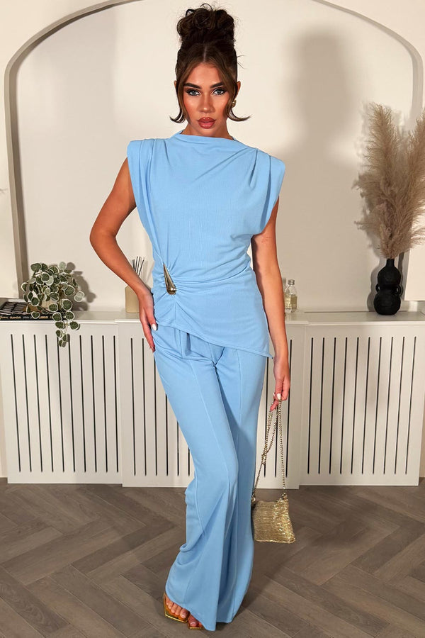 Blue Wide Leg Trouser & Shoulder Pad Top Co Ord With Gold Buckle Detail