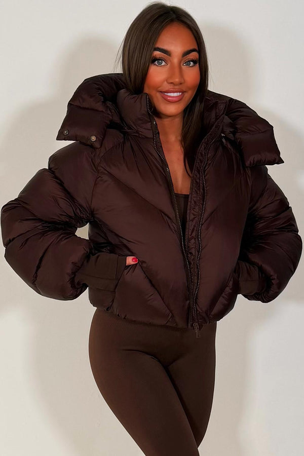 Puffer padded jacket with hood. Puffer jacket weather resistant quilted padded detailing. This crop padded puffer jacket has detachable hood long sleeves thumbholes and pockets. Style this puffer jacket with...