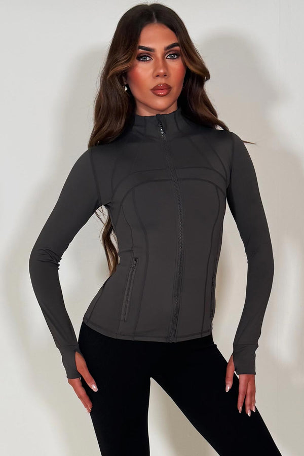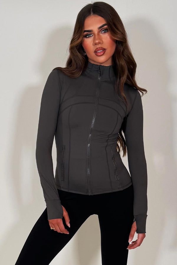 Sports jacket with zip up front. This sports jacket is fitted sits above hips contour skims your body. Long sleeves and thumb holes keeps sleeves down and chiles out. This...