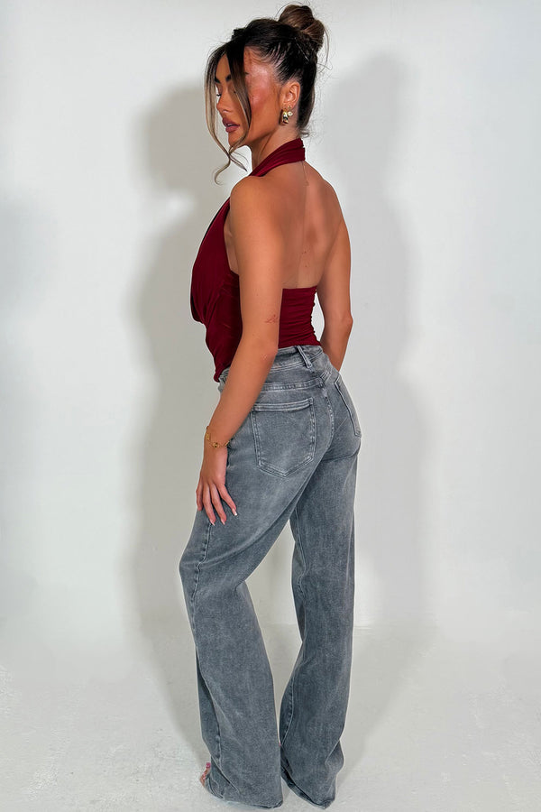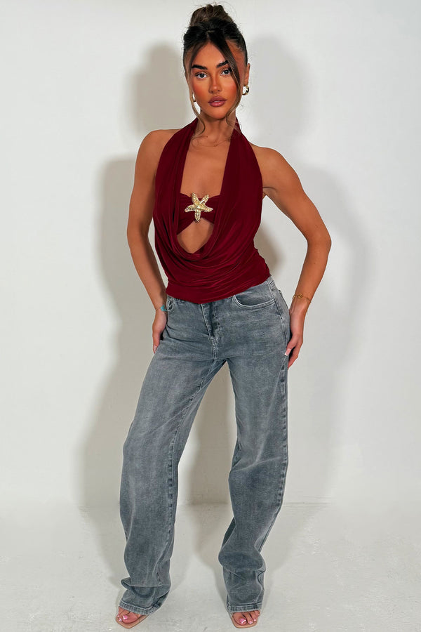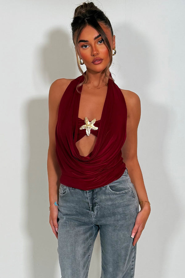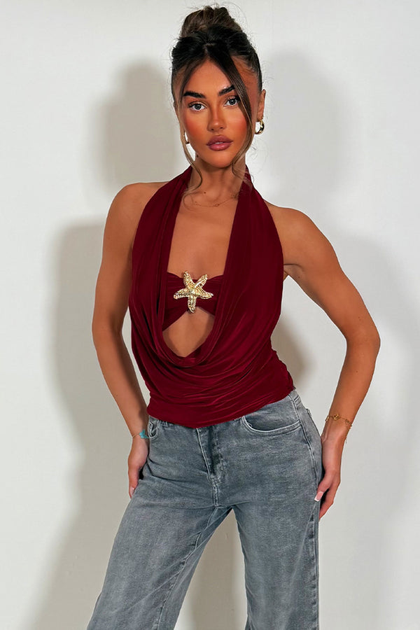 Burgundy Cowl Halter Backless Top With Gold Buckle