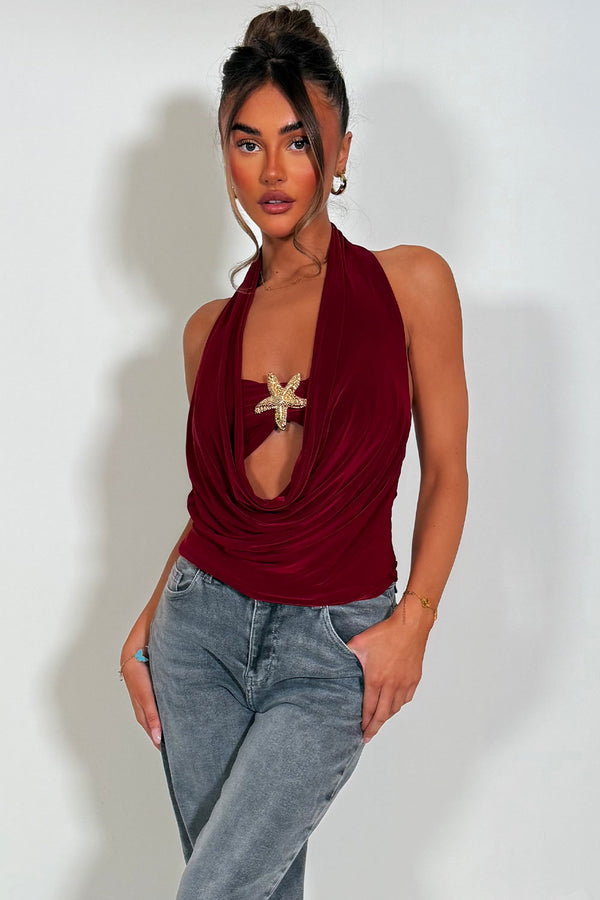 Cowl halter backless top with gold buckle detail. This halter neck top is going to keep all eyes on you babe. Featuring cowl halter neck top backless with gold star...