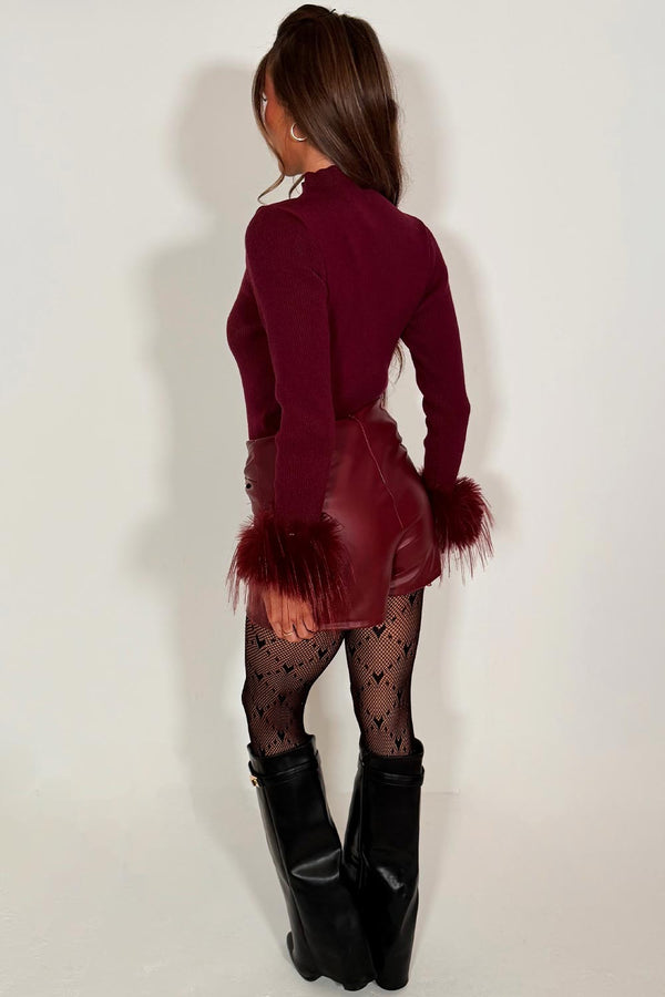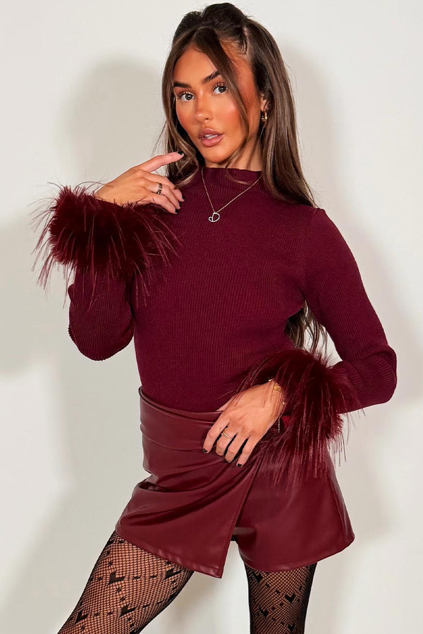 Burgundy Knitted Jumper With Fur Cuff Long Sleeves