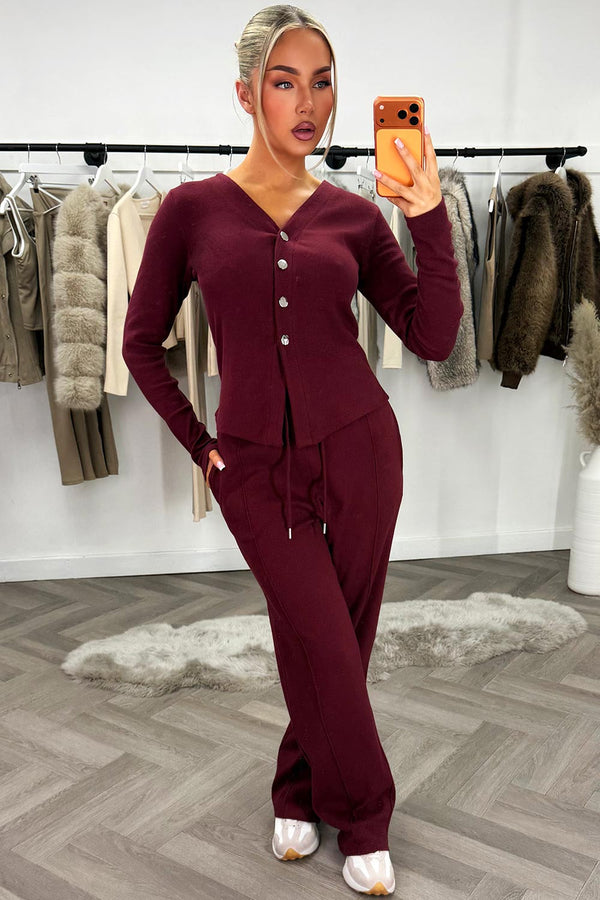 Burgundy Long Sleeve Top And Trouser Co Ord With Buttons
