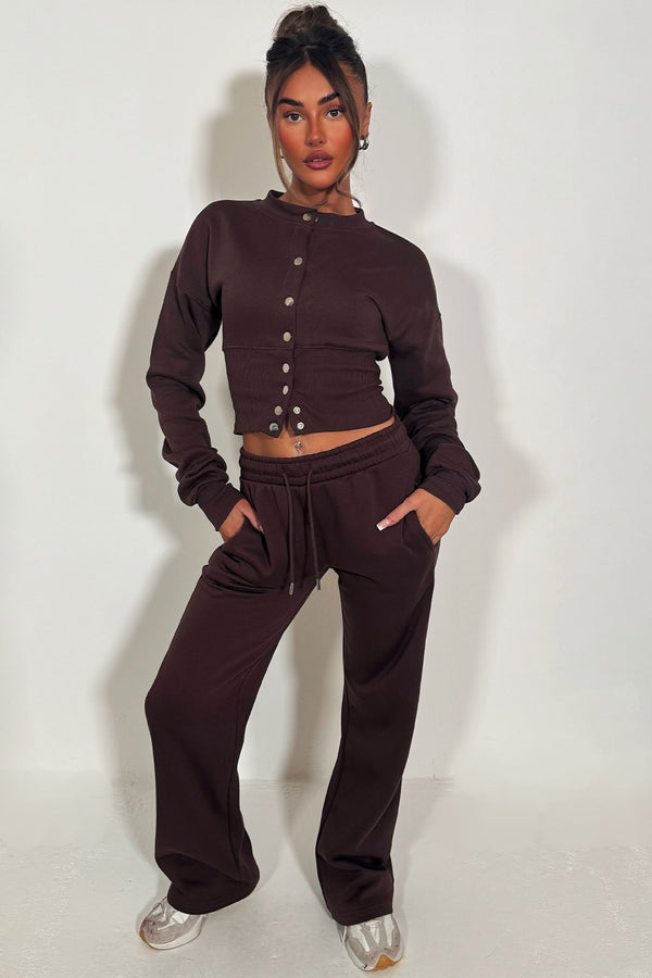 Button Up Corset Sweatshirt And Jogger Tracksuit Co Ord Brown