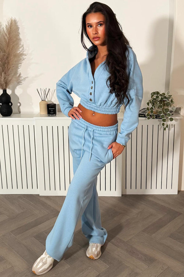 Button Up Crop Hoodie And Jogger Tracksuit Co Ord Baby Blue