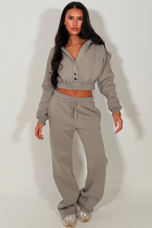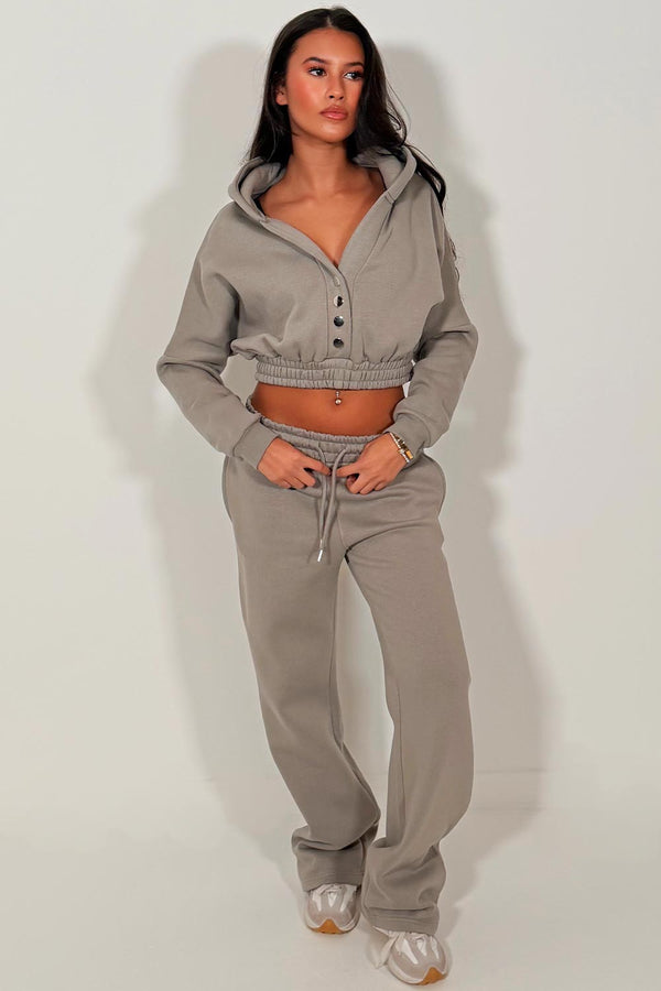 Button Up Crop Hoodie And Jogger Tracksuit Co Ord Dove Grey