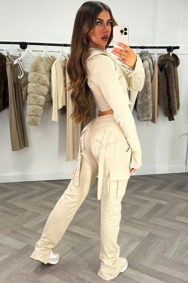 Cargo Joggers And Crop Corset Hoodie Tracksuit Set Oatmeal