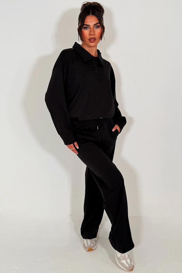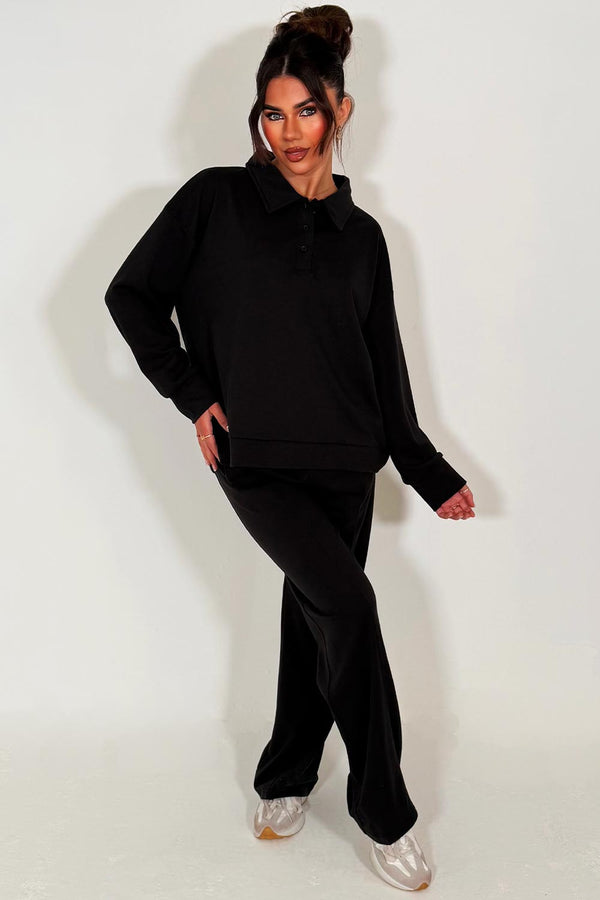 Collared Button Up Front Sweatshirt And Joggers Loungewear Set Black