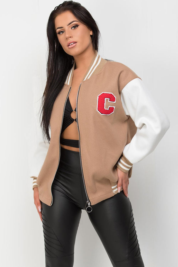 Varsity bomber jacket. These baseball jackets are becoming most wanted trend right now. This letterman jacket features C detail contrast sleeves and zip fastening. Wear it with our high waisted jeans...