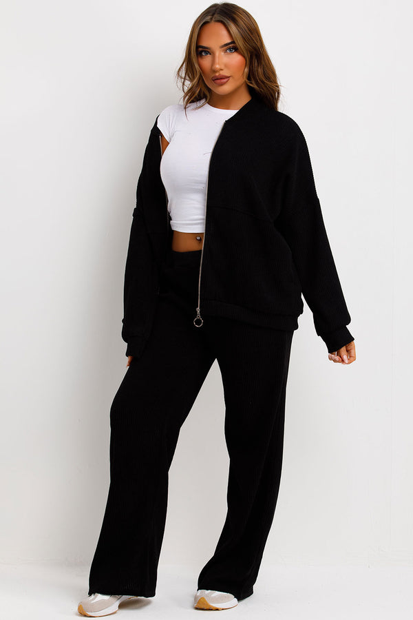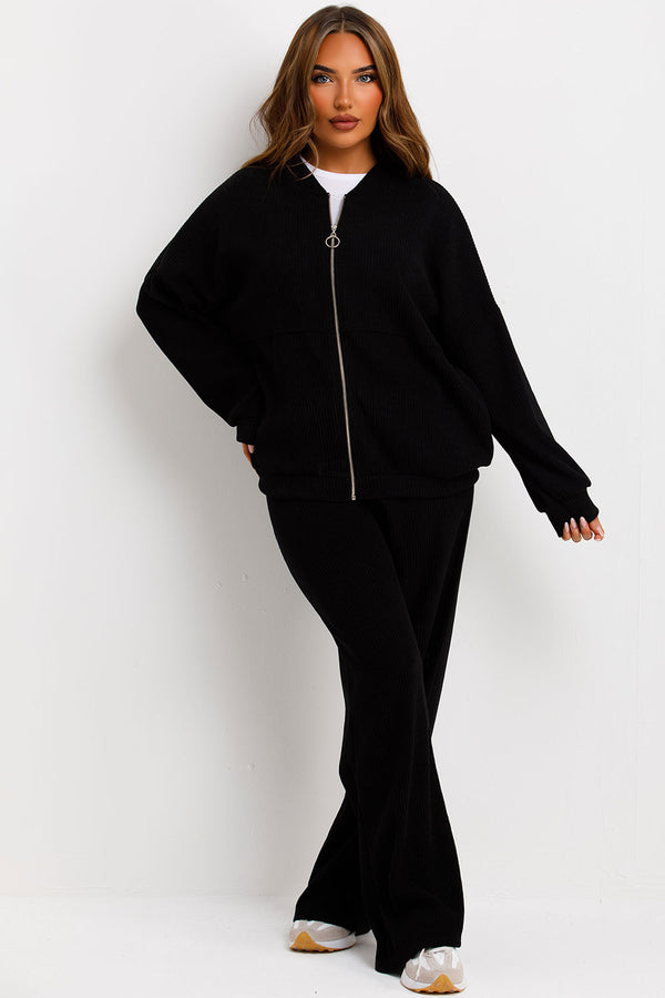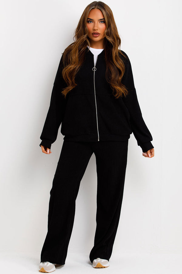 Corduroy Bomber Sweatshirt With Zip And Jogger Loungewear Set Black