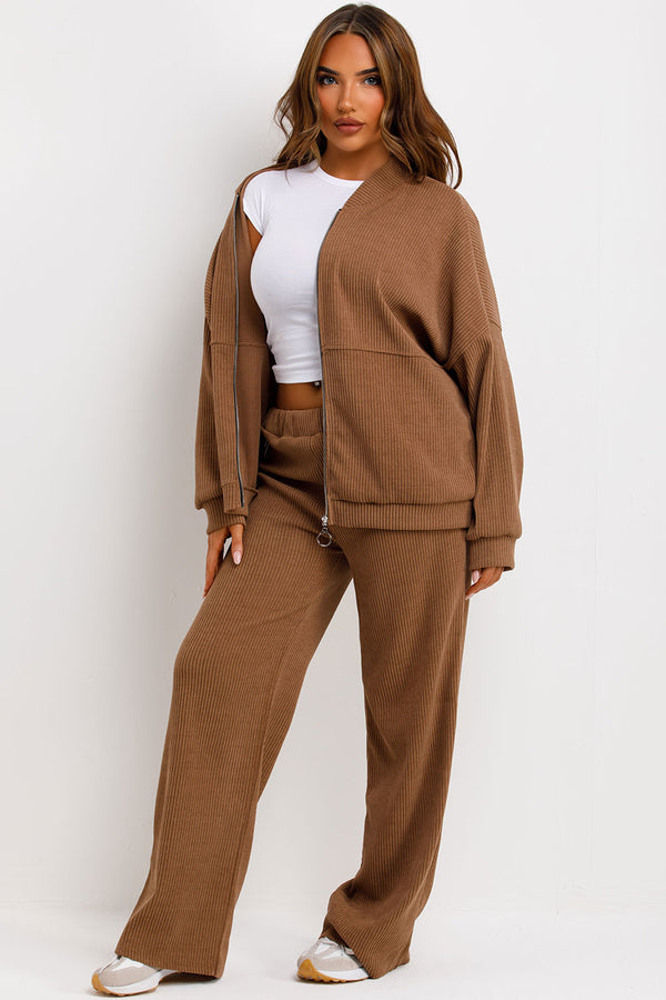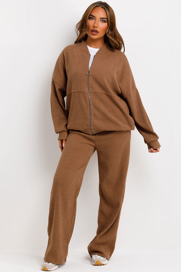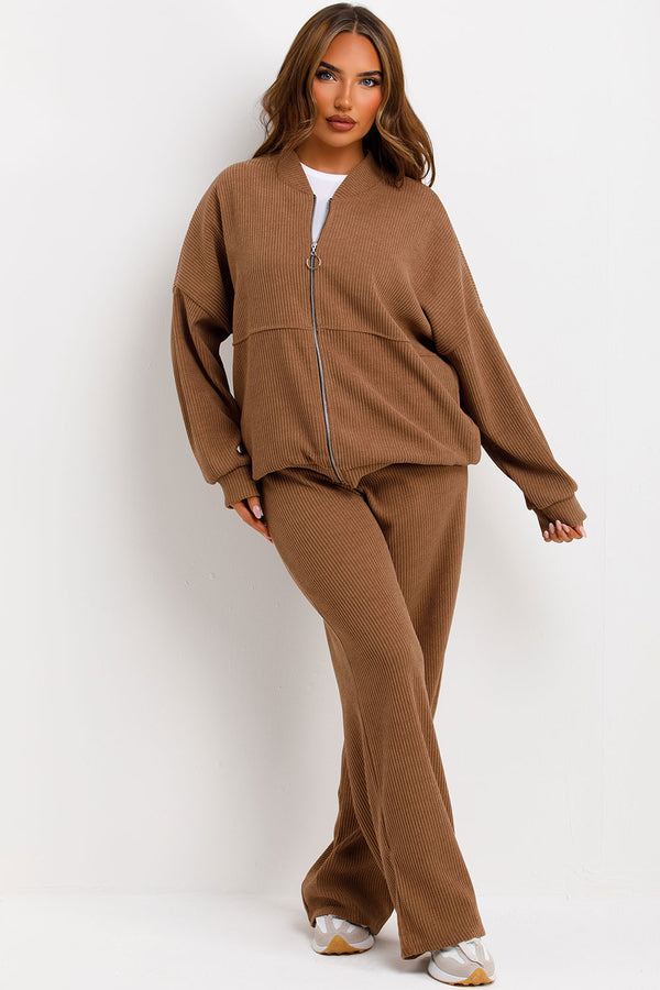 Corduroy Bomber Sweatshirt With Zip And Jogger Loungewear Set Camel