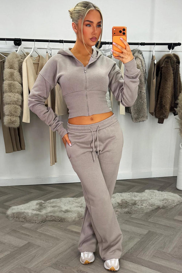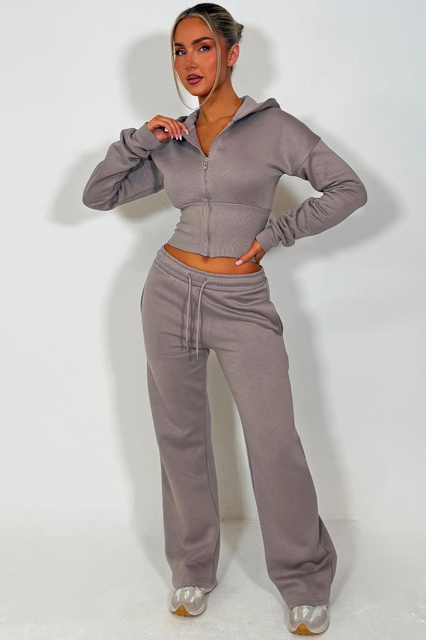 Corset Zip Up Crop Hoodie And Jogger Tracksuit Co Ord Set Dove Grey