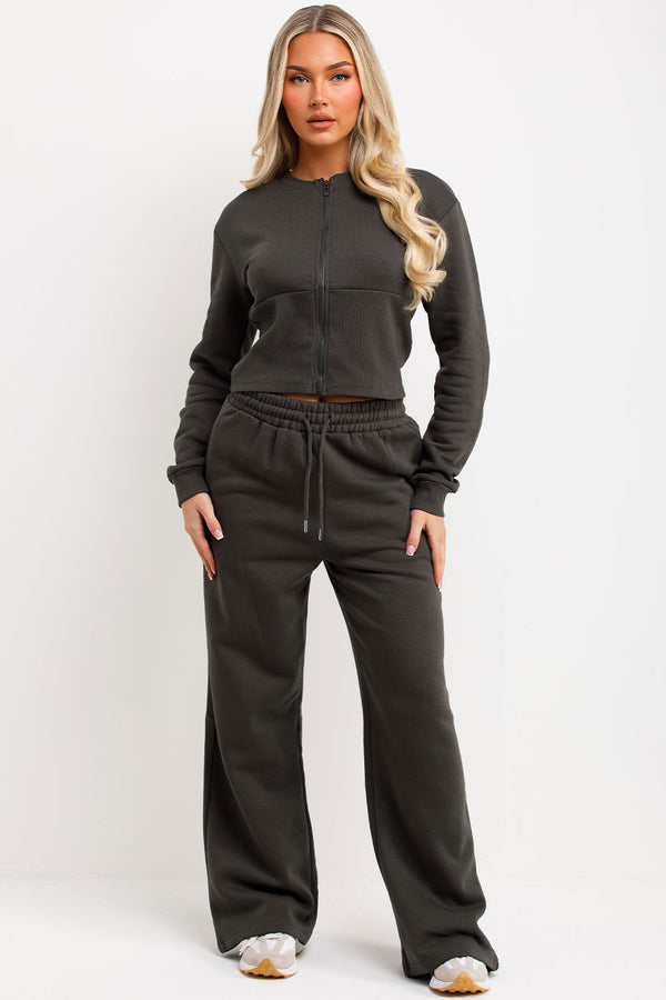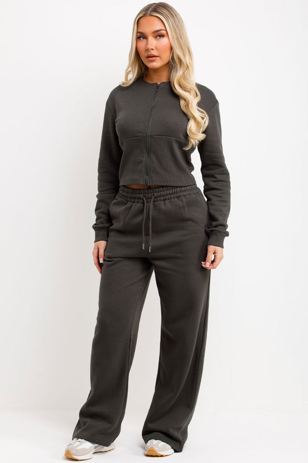 Corset Zip Up Crop Sweatshirt And Joggers Tracksuit Co Ord Set Khaki