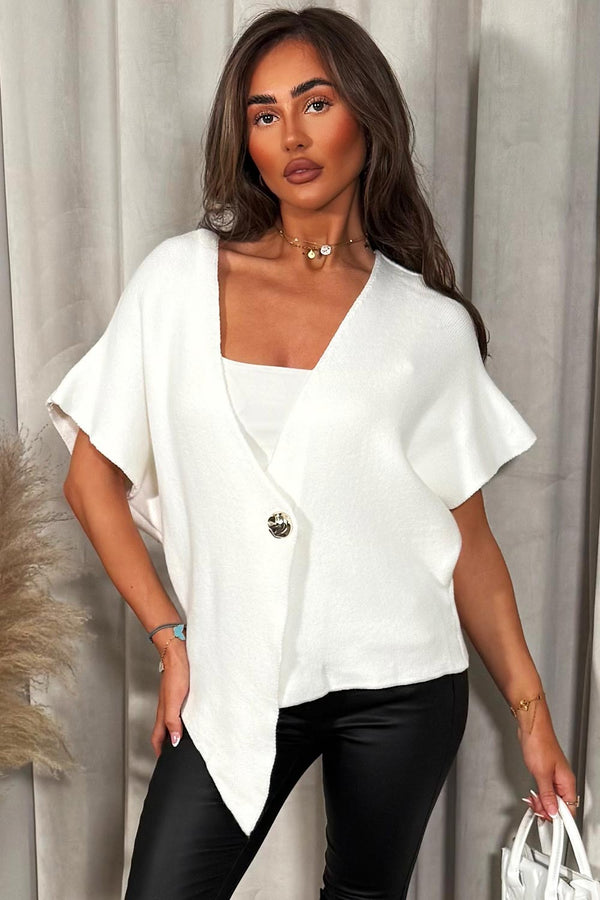 Cape cardigan with gold button detail. This gold button cardigan cape is going to keep you warm in style. Featuring knitted cardigan cape style with gold button fastening , soft...