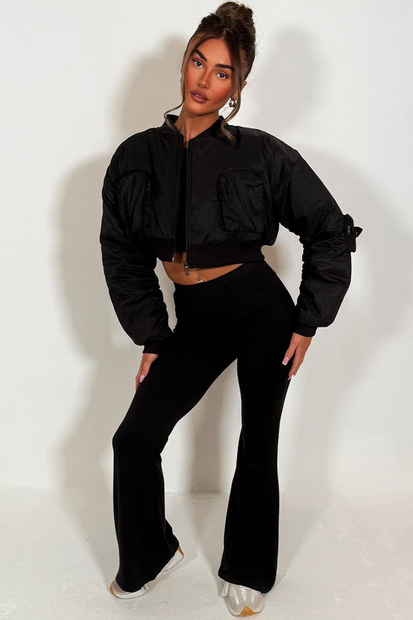 Crop Bomber Jacket With Pockets Black