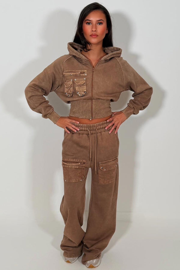 Crop Hoodie And Jogger Tracksuit Co Ord With Pocket Detail Brown