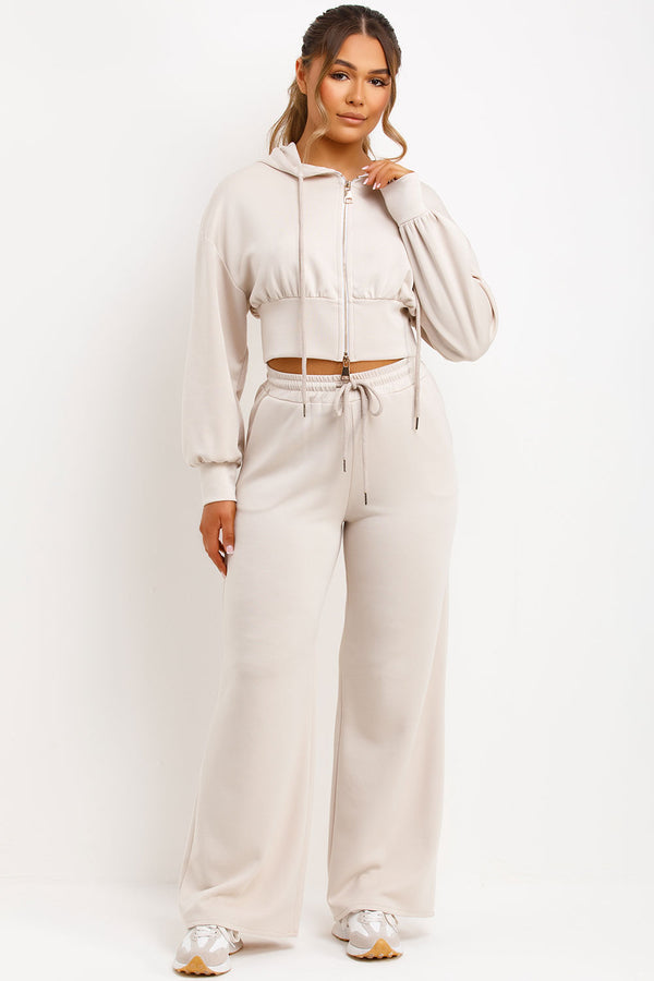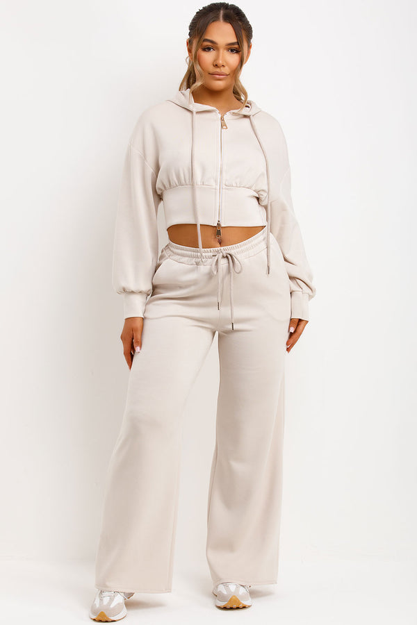 Crop Hoodie And Wide Leg Trousers Loungewear Set Beige