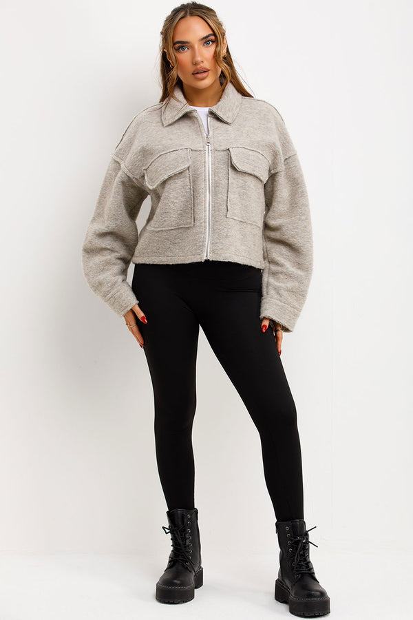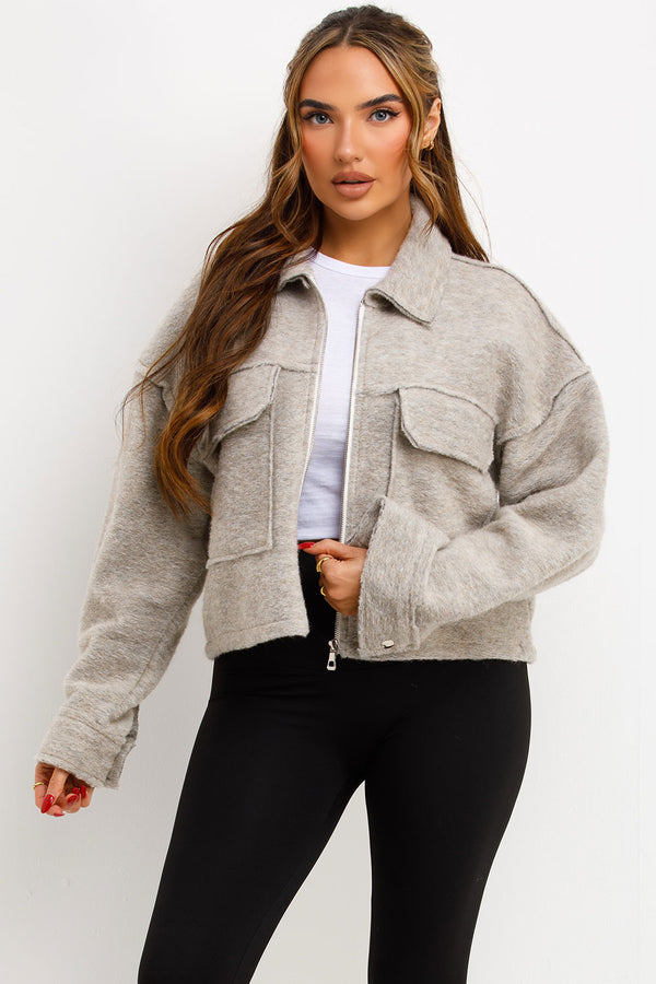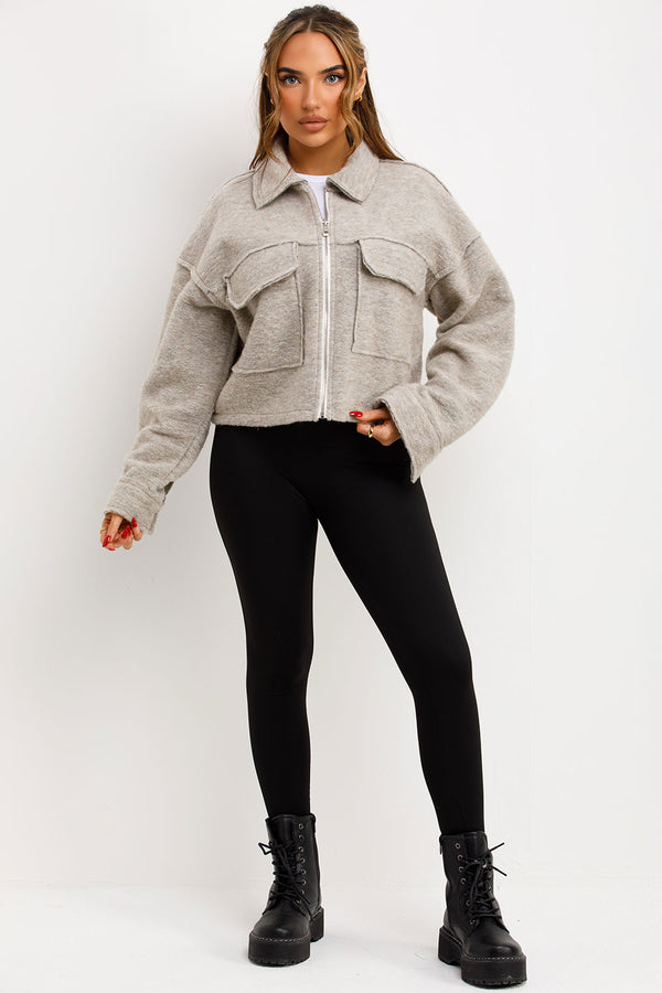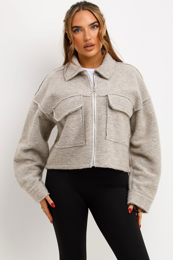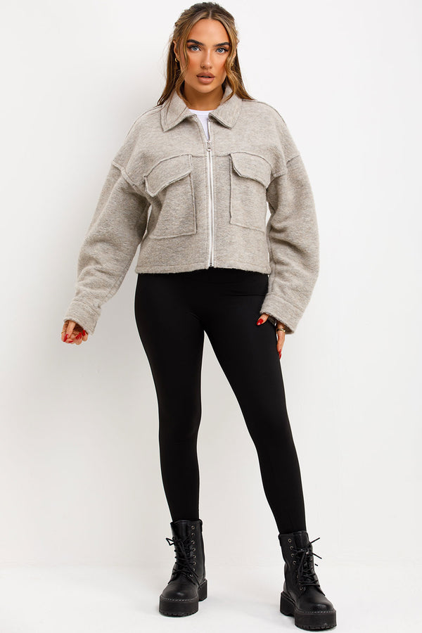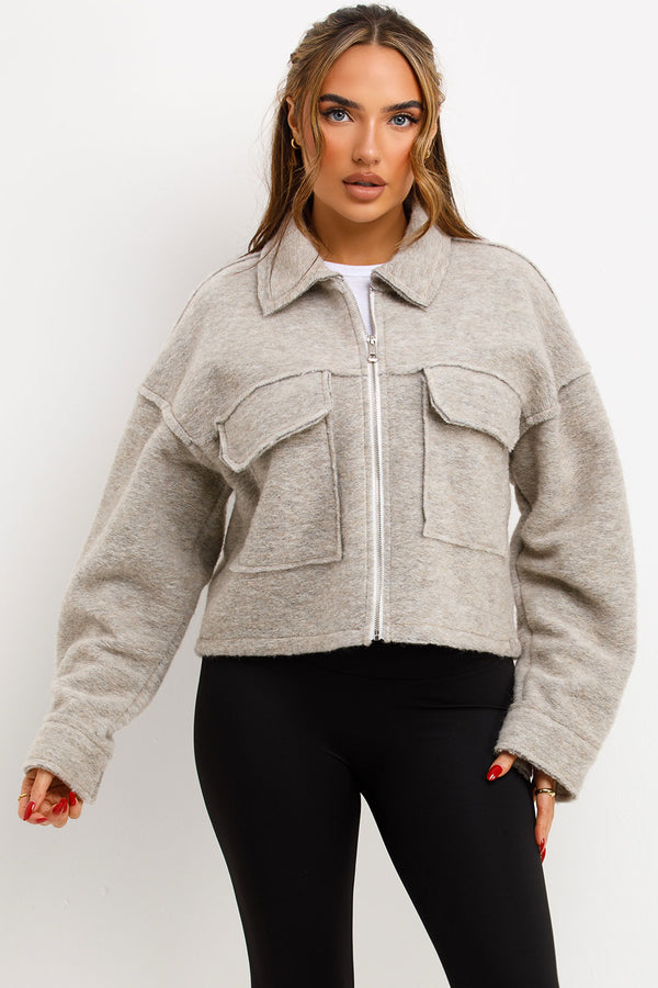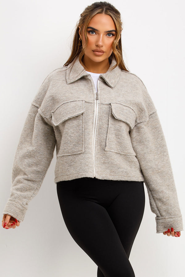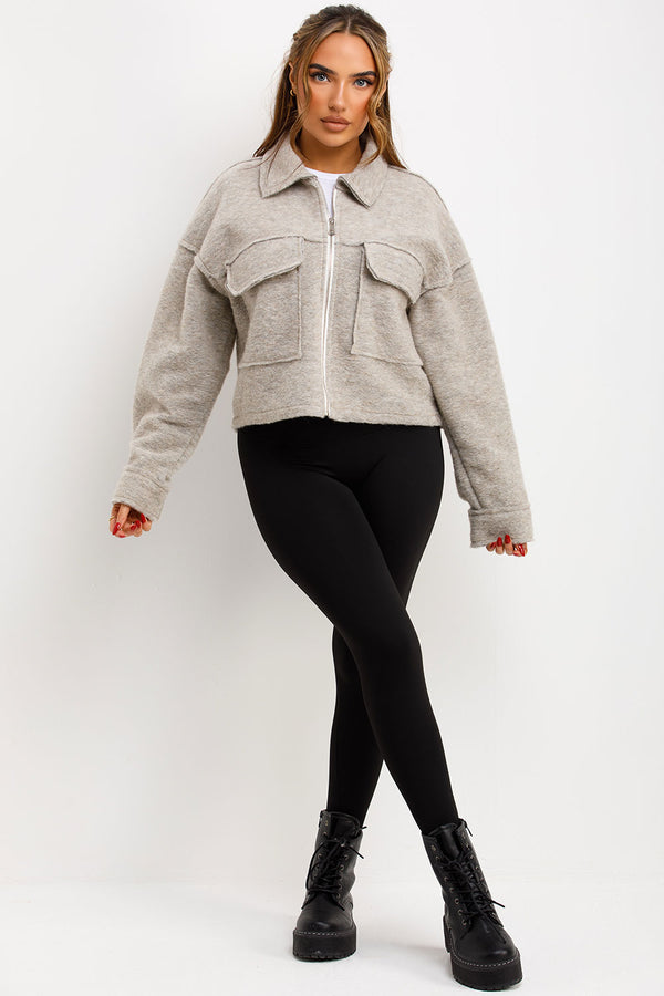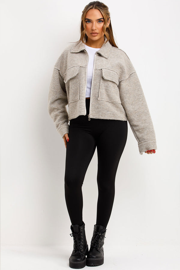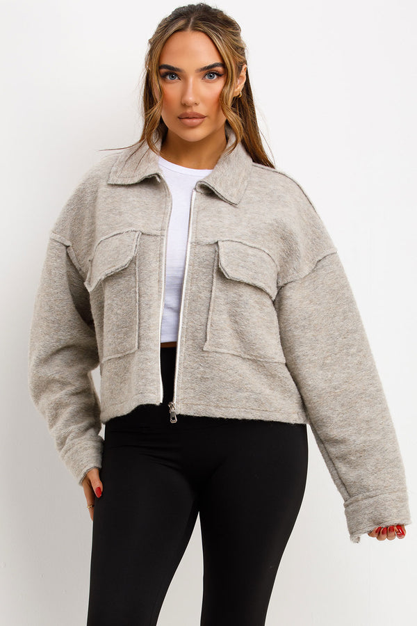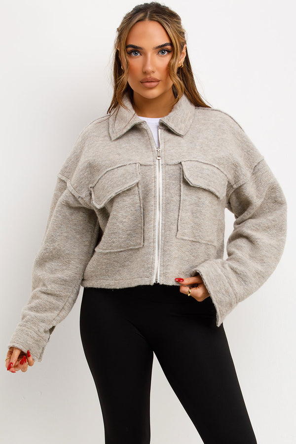 Crop jacket with pockets. This cropped jacket is going to keep you cozy and loking fit in all seasons. Featuring crop jacket zip fastening collar and pocket detail soft fleece...
