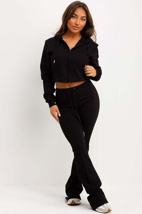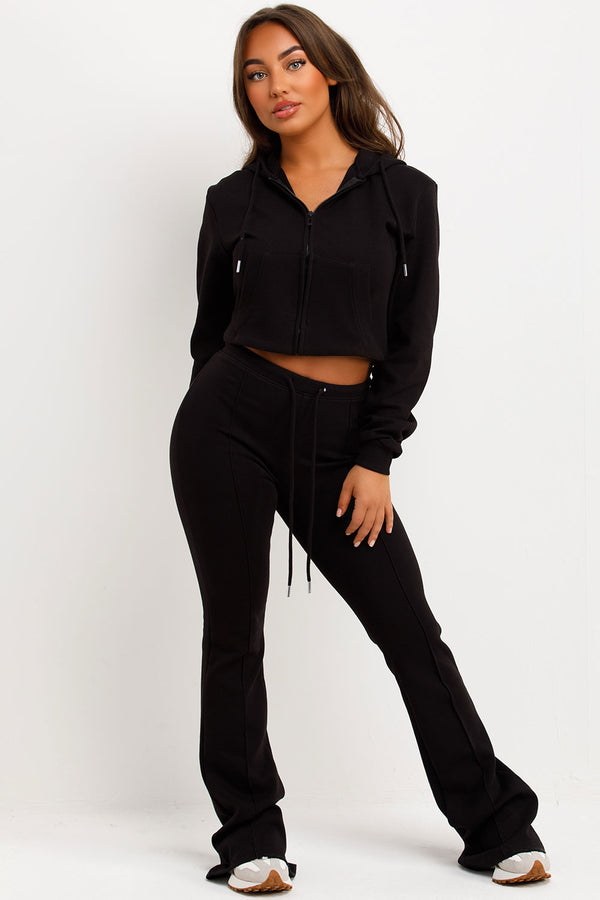 Crop Sweatshirt Hoodie And Bell Bottom Trousers Loungewear Set Black