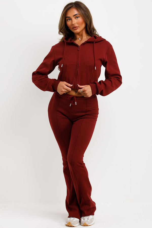 Crop Sweatshirt Hoodie And Bell Bottom Trousers Loungewear Set Burgundy