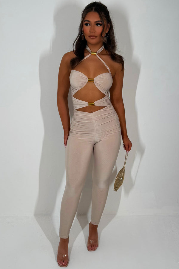 Cut Out Jumpsuit With Gold Metal Detail Beige