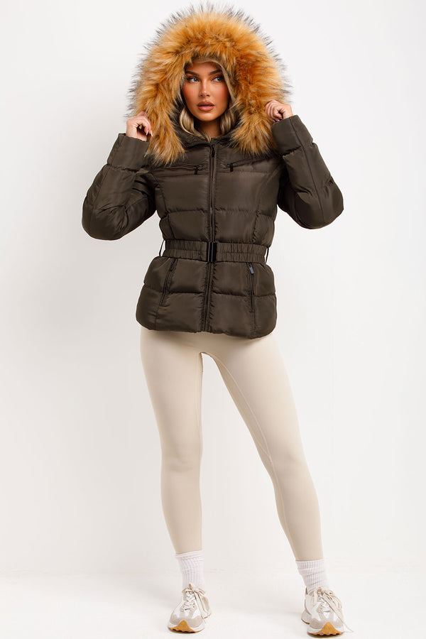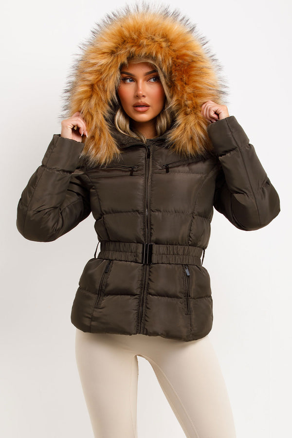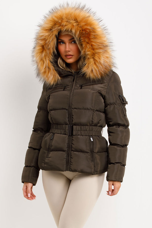Faux Fur Hood Puffer Jacket With Belt Khaki