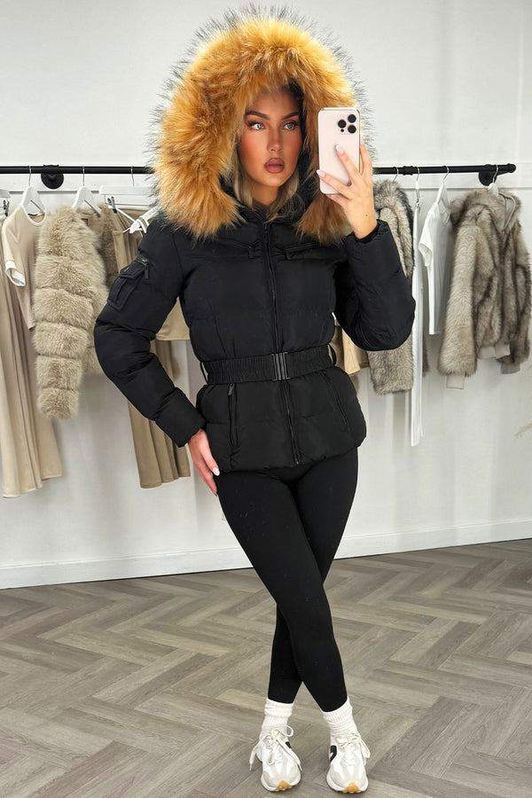 Faux fur hood puffer jacket with belt. Featuring thick padded material, detachable faux fur trim, hooded ,belt, zip fastening and pockets on either side. Style it up with skinny jeans...