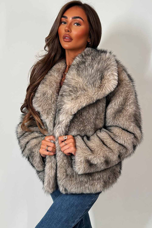 Fur jacket with collar. This collared faux fur jacket is a must have outerwear trend for this new season. This premium fur jacket features faux fur vegan friendly button fastening...