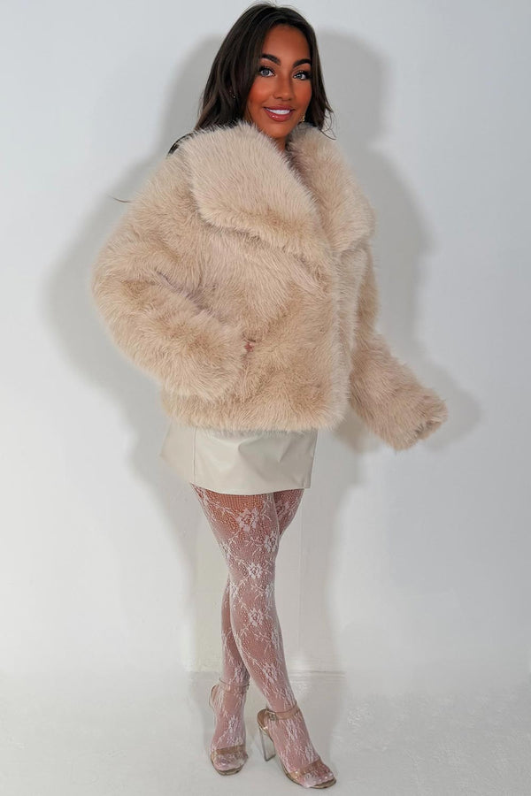 Fur jacket with lapel collar and long sleeves. This collared faux fur jacket is a must have outerwear trend. This premium fur jacket features collar faux fur vegan friendly button...