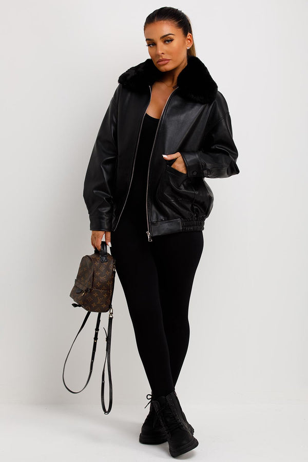 Faux leather jacket with faux fur collar. This faux leather bomber jacket is going to be a perfect addition in your everyday attire for new season. Featuring faux leather bomber...