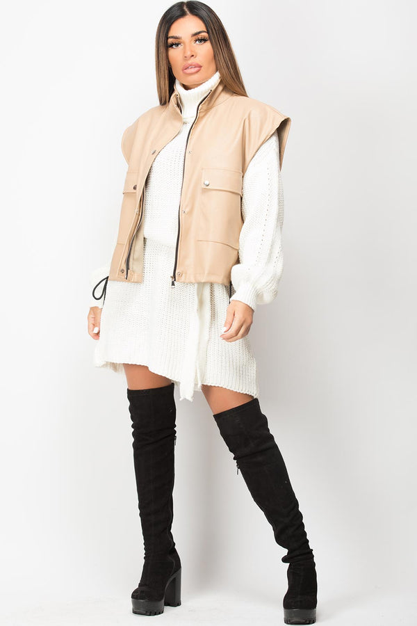 Faux leather jacket in beige, sleeveless, zip and stud fastening with drawstring hem, 100% vegan pu faux leather material. Style this sleeveless jacket with our jumper dress and knee high...