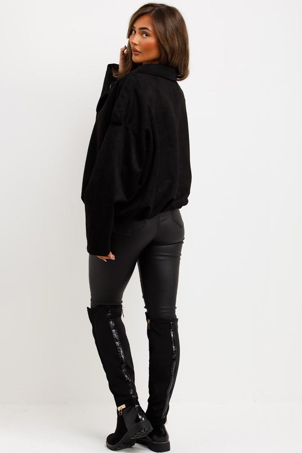 Faux suede puffed bomber jacket with tabs. Bomber jacket made with faux suede long puffed sleeves gathered hem shoulder tabs and zip up front. Style this faux suede puffed bomber...