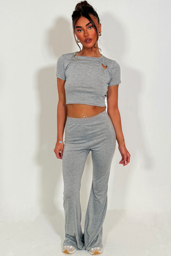 Flared trouser and crop top co ord set with heart detail. These flared trouser and top set is going to give you cool looks with comfort. Featuring flared leg trouser...