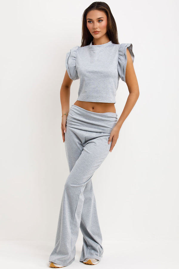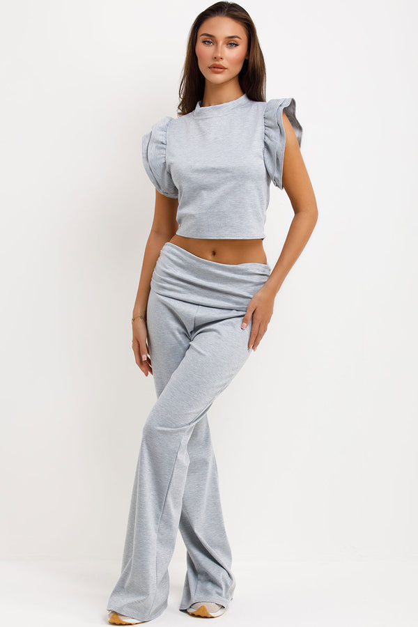 Fold Flare Trouser And Frill Sleeve Top Co Ord Set Grey