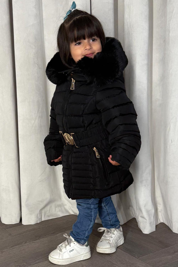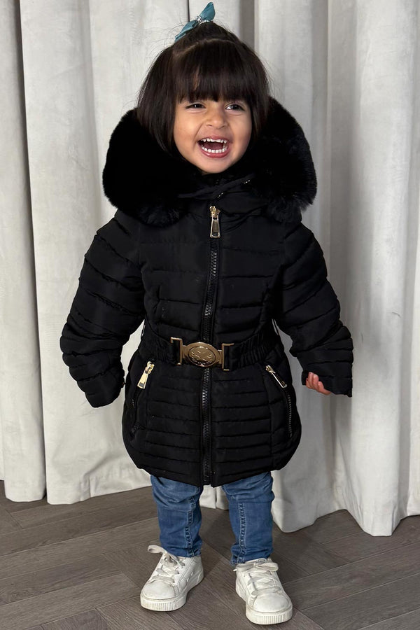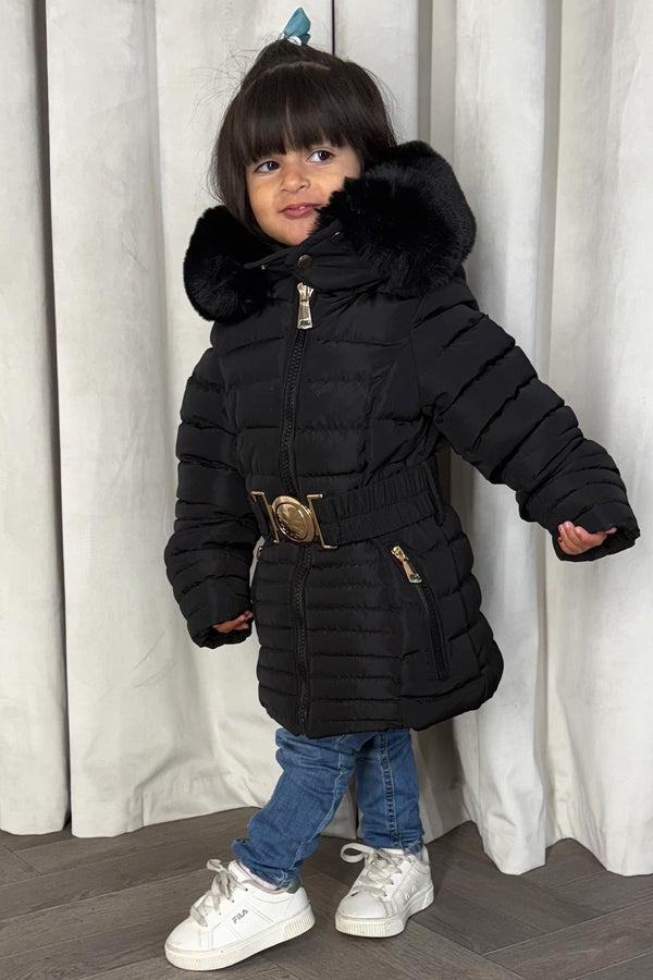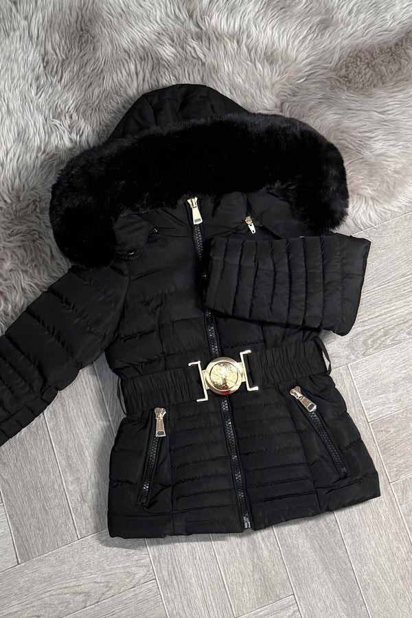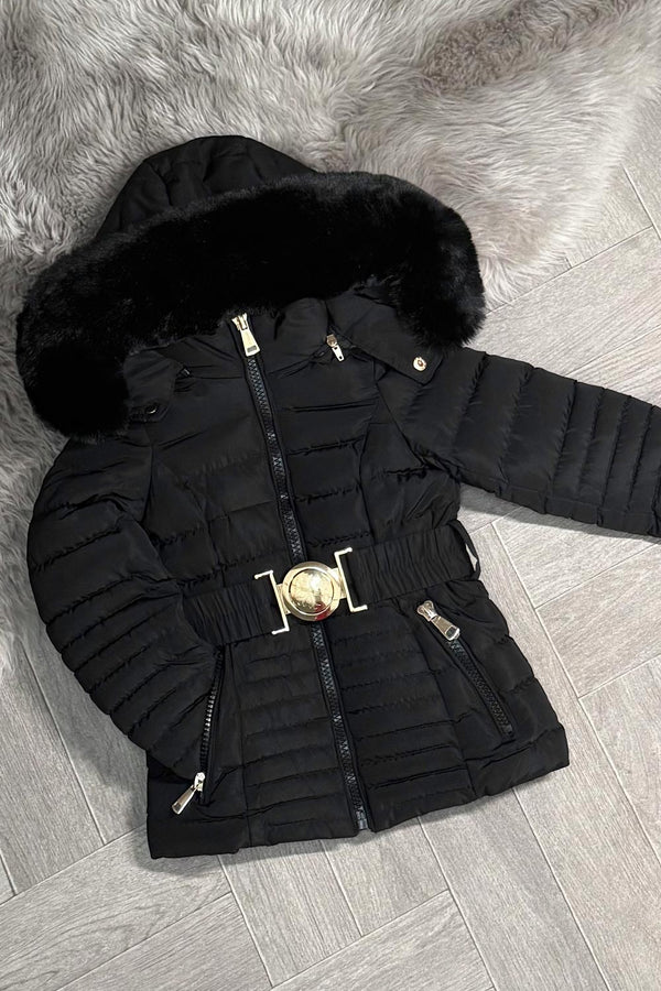 Girls Black Puffer Jacket With Faux Fur Hood And Gold Belt