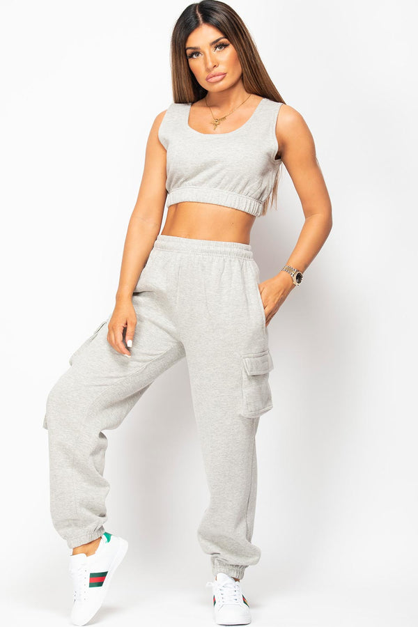 Chilled vibes in this utility pocket joggers and top set. Featuring soft grey fleece material, joggers with utility pockets, elasticated drawstring waist and matching top. Style it with chunky trainers...