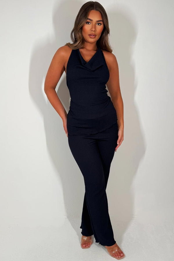 Halter Neck Backless Top And Trousers Co Ord Set Navy