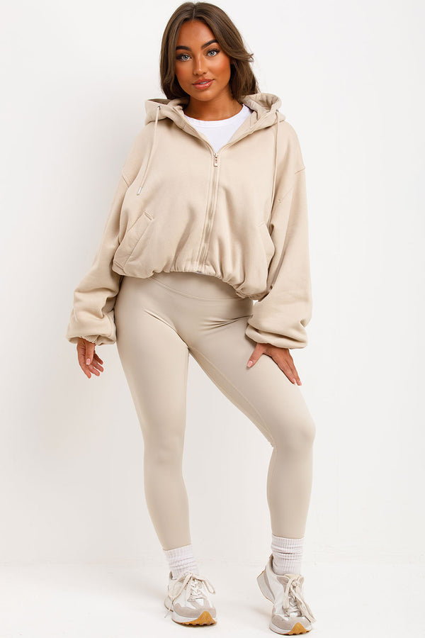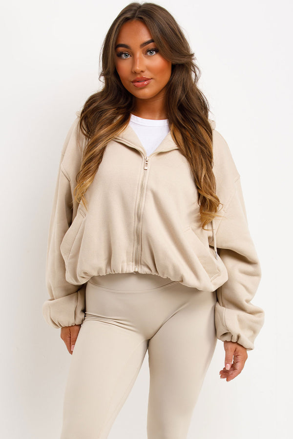 Hooded Jacket With Elastic Hem Beige